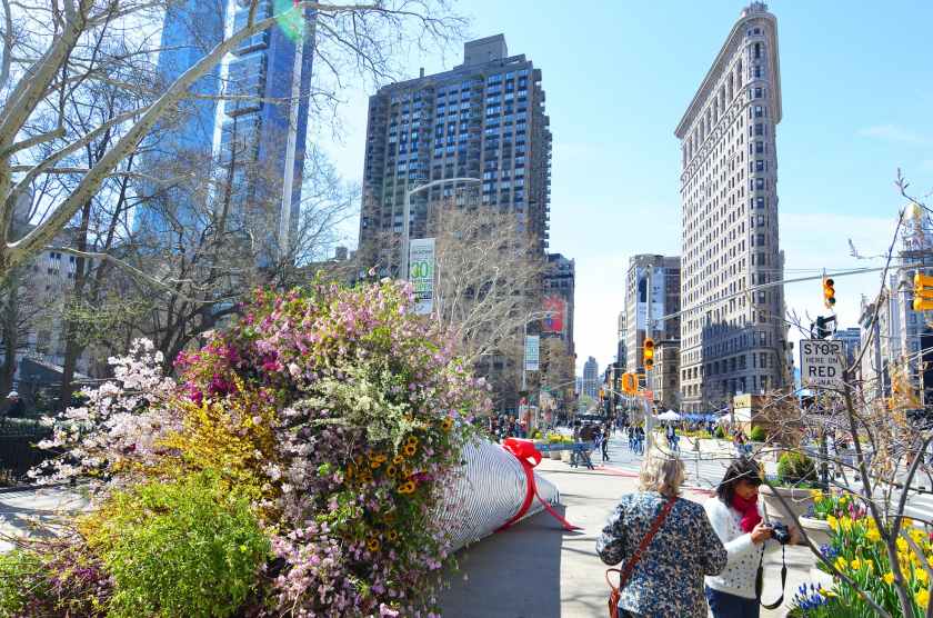 El ramo más grande de Nueva York se sitúa en la calle 24 y Broadway, uno de los puntos más concurridos de la ciudad. Y muestra al público una variedad de ramas coloridas y diversos arbustos florales.
