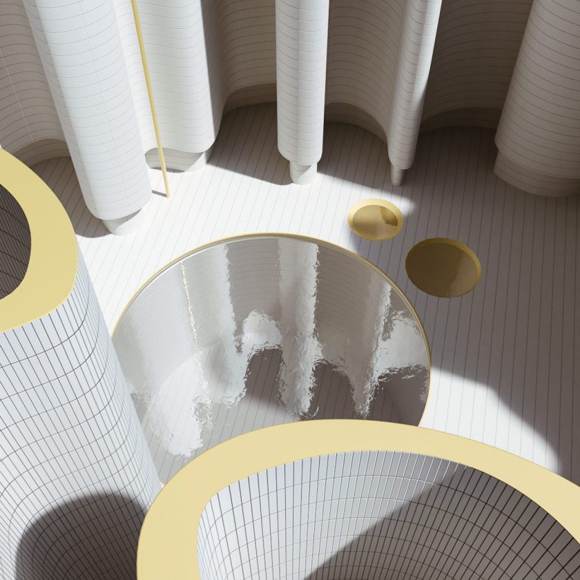 La mayoría de los diseños de Christodoulou son espacios exteriores, siempre en colores pastel y blancos. También hay mucho de los clásicos patios de templos egipcios donde la piedra esculpida cumple un rol fundamental, el artista además incluye mobiliario y esculturascreadas por él, aunque también objetos icónicos como la silla ‘S40’ de Thonet diseñada por Martin Stam en 1935. Otro de los detalles que aportan identidad a su obra es la textura del agua que logra Alexis, donde la densidad y movimiento son muy sugerentes.