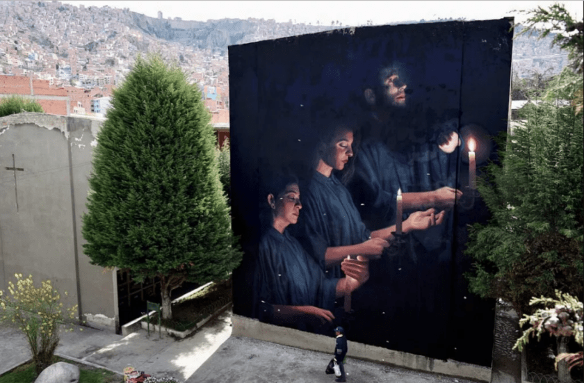 Los espacios públicos no solo son los que están abiertos hacia la calle, también los hay adentro. Es el caso de los cementerios, lugares amurallados que, sin embargo, tienen libre acceso; y fue el famoso Cementerio General de La Paz en Bolivia donde se dieron cita los más influyentes muralistas latinoamericanos en noviembre pasado para hacer un homenaje multitudinario a los muertos que ahí yacen.
