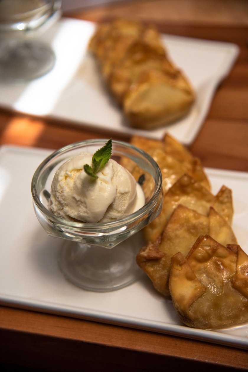 Como postre, probé unos inusuales wantanes dulces rellenos acompañados de una trilogía de helados naturales de vainilla, coco y piña-jengibre, este último superó mis expectativas, ya que logró una perfecta armonía entre la dulzura de la piña y la frescura del jengibre.