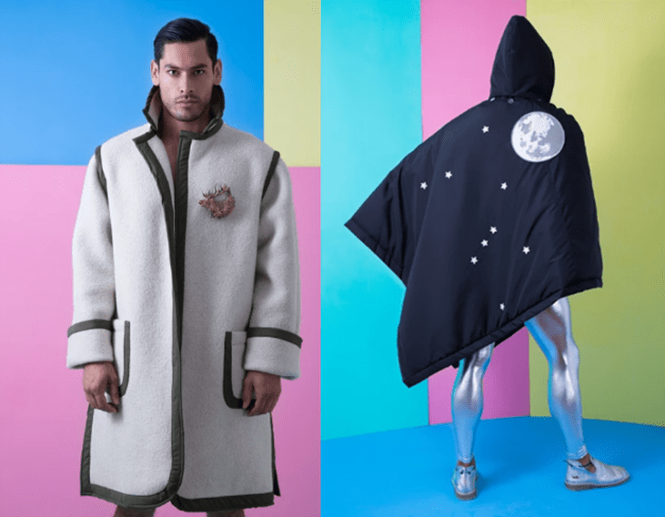 La silueta del amarillo por ejemplo (Zenital) es una silueta tipo kimono, super rectangular y cuadrada y cae super bien y esa fue la que trabajamos. Y lo que cambió fue que le aplicamos un estampado y plumas, porque tengo también una silueta parecida a una capa que no tiene relleno y las dos son ya parte de la marca.