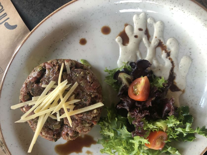 Respecto de la comida, comenzamos con «Tartar Flat Iron» ($7.800) carne cruda picada y que se sentía muy suave al degustarlo. También probamos «Champignones Rellenos» ($6.800) de gran tamaño los que acompañé con Sangria Cinnamon Fizz ($6.400) un coctel con Gin, cabernet, canela, naranja y limón, bien frío es perfecto. Algo que me pareció excelente es que cada comensal tiene un plato de metal y madera que viene caliente, así que todos los alimentos se mantienen a buena temperatura un buen rato.