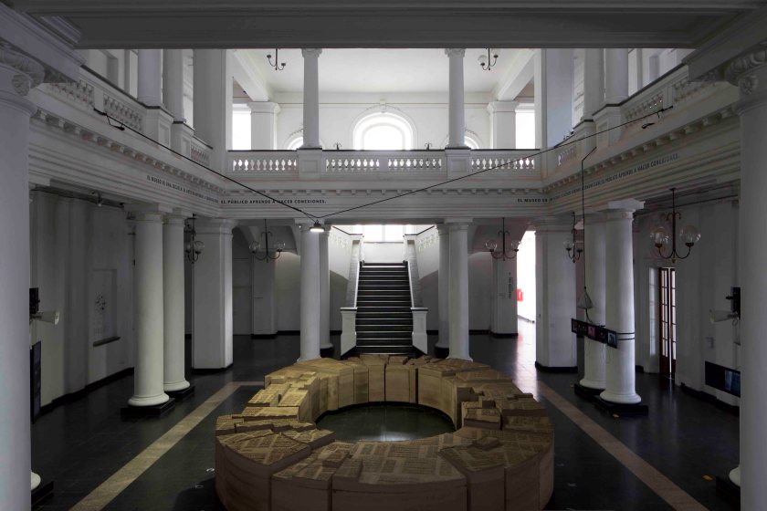 En el hall central del museo se despliega un modelo a escala del edificio, realizado in situ en bloques de tierra compactada que en sus superficies superiores tiene estampado el fragmento de trama urbana de la ciudad que representa. Un palimpsesto de múltiples periferias se hace presente en el dibujo, en el evento, en el edificio.