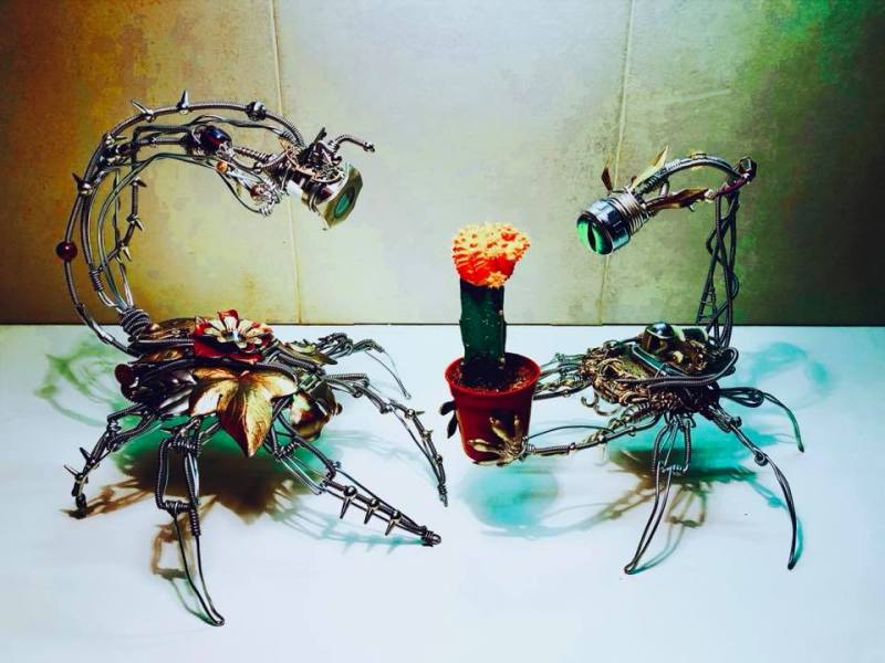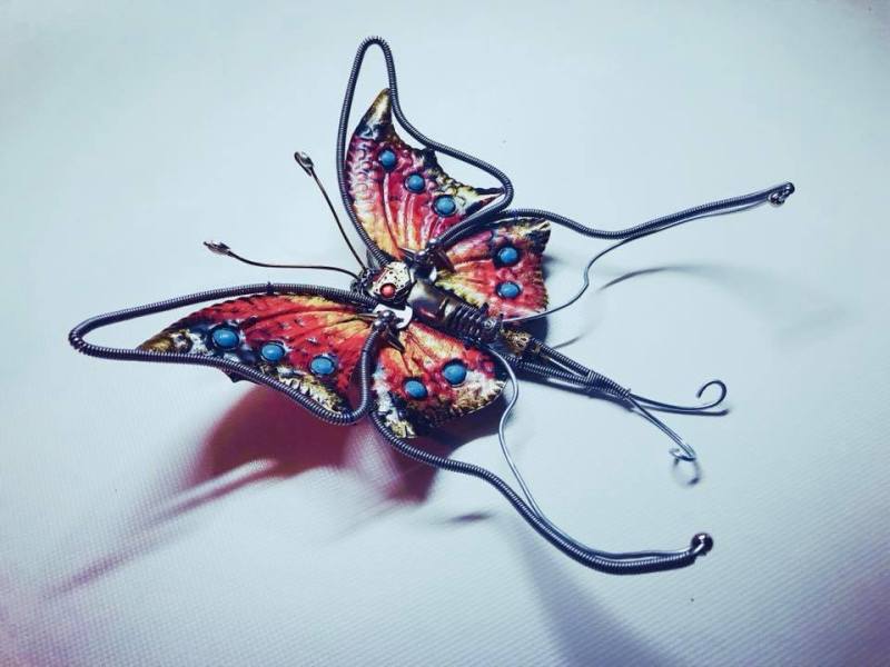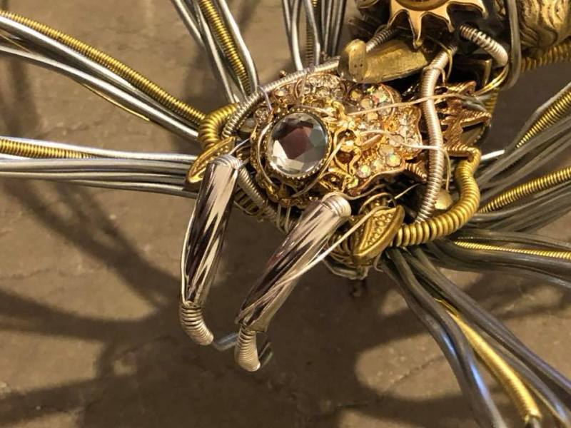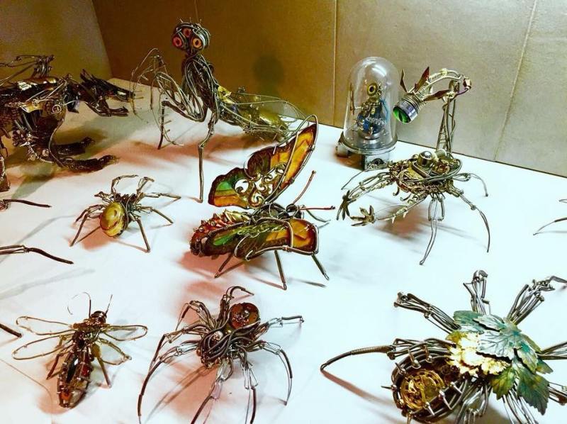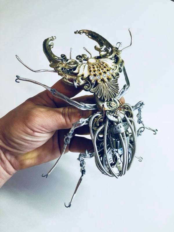Tomando materiales reutilizables o de recuperación, crea formas de insectos y animales extraordinarios, saliendo de la forma tradicional de estos seres que se pueden ver en la naturaleza, agregando la belleza en si misma que entregan las piedras preciosas, da como resultado una pieza artística única y original.