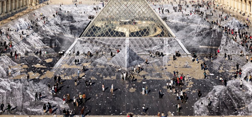 El artista frances JR es conocido por obras de intervención urbana a icónicos edificios de diferentes partes del mundo, siempre jugando con la magia de las ilusiones ópticas y las nuevas posibilidades de los espacios públicos. En esta ocasión, cubrió de papel alrededor de la pirámide Louvre para darle un nuevo sentido al lugar.