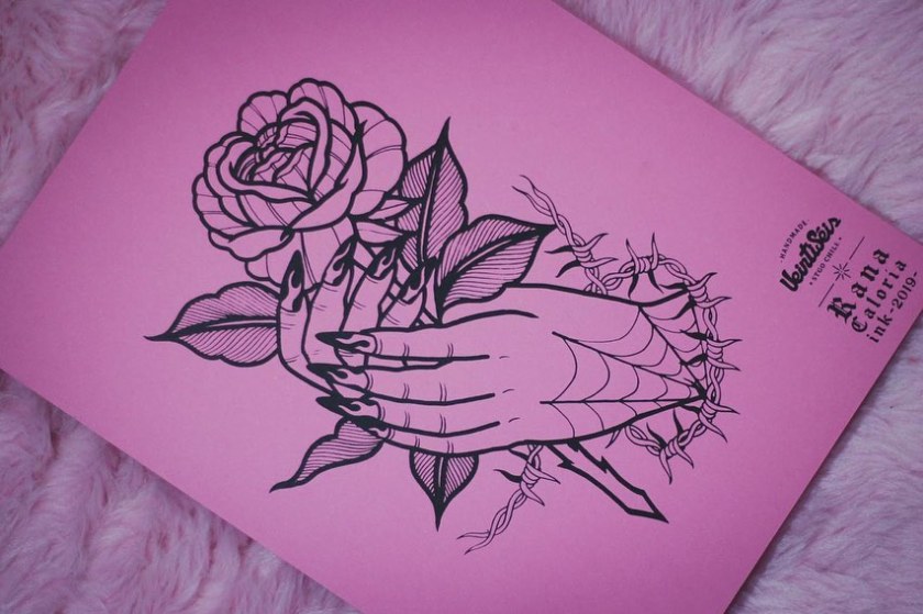 Reconocida por su estilo de tatuajes en blackwork y dotwork, Ranacaloriaink quien es parte del equipo de planta de Sakura Tattoo, plasma uno de sus representativos diseños en esta edición limitada, una mano de mujer tatuada envuelta en la muñeca con un alambre de púas y entre sus dedos una rosa. Según la tatuadora este representa “proteger lo que amas con fuerza y pasión”.