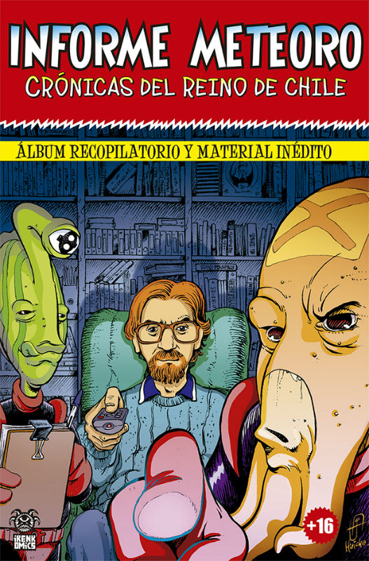 Varios años después, un amigo me regaló Informe Meteoro (crónicas del reino de Chile), un libro recopilatorio de comics que reúne a varios artistas en torno a 2 extraterrestres provenientes del planeta Irenko que llegan a Chile a investigar, cómo no, si existe vida inteligente en este país.