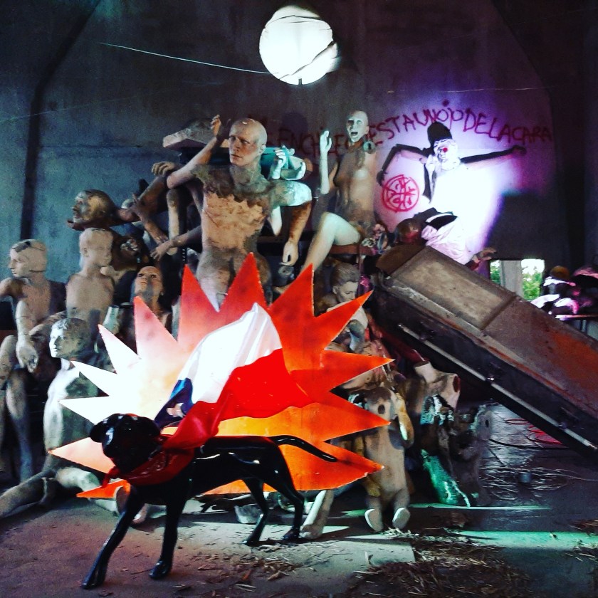 “Salí de Chile antes de que explotara todo y, a mi regreso, me encontré con otro estado de las cosas, generado por esta performance de grande magnitudes, de dimensiones impensadas, que han vivido todos. De eso habla esta exposición, que en realidad es una puesta en escena de taller, una urgencia colorada”, dice Becerro, quien trabajó con maniquíes, spray, esculturas caninas en fibra de vidrio, luces láser y algunos recursos escenográfico y arquitectónicos preexistentes para dar forma a su composición.