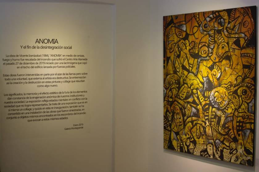 Con el afán de seguir con la muestra que se exhibía hasta el 15 de enero en el siniestrado Centro Arte Alameda, obras que en un número no menor se incendiaron. Desde el 16 de Enero, en un hito simbólico la muestra “ANOMIA” de Vicente Irarrázabal (1985) se traslada a la Galería de Arte Montegrande, se encuentra ubicada en la calle Victoria Subercaseaux #295, Barrio Lastarria.