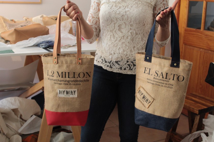 “El Salto”, “Paz” y “1,2 millón” son algunas de las frases contenidas en tres diseños con los que Juliana Mierez quiso plasmar la situación país originada el 18 de octubre. “También tuvimos una baja muy grande de ventas, entonces teníamos que sacar algo que sea emergente, algo que sea rápido y que represente estos momentos históricos que estamos viviendo por eso salieron tres bolsos significativos con frases significativas. Que son más pequeños, de un precio muy accesible para el público”, planteó.