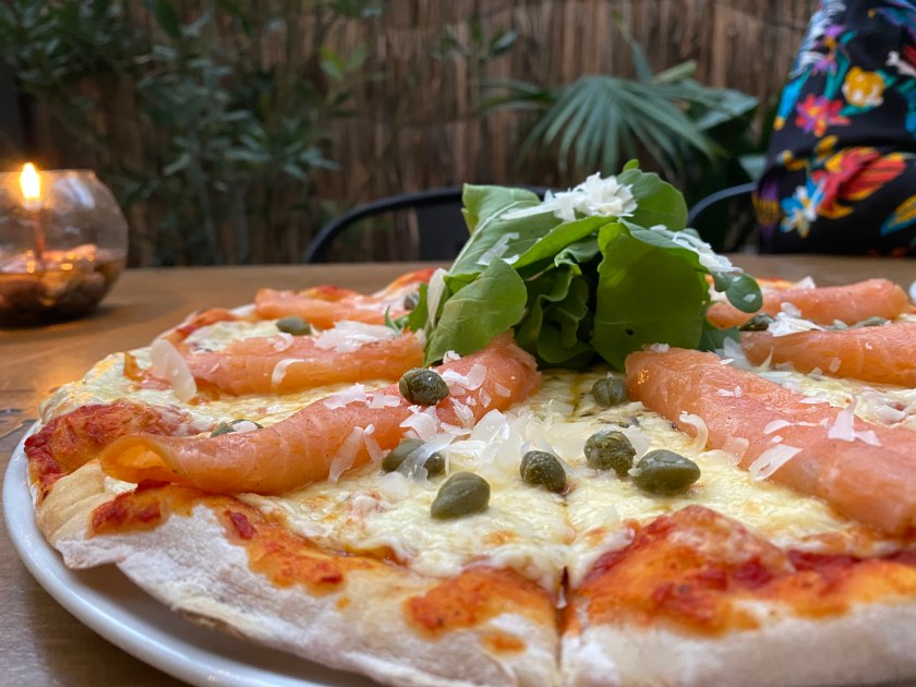 Pizza Salmón: Pomodoro, Mozarella, Salmon Ahumado, Alcaparras, Rúcula y Parmesano.