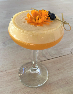 Preparación: Vertir los ingredientes en una coctelera, agregar hielo y agitarla mezcla. Servir en una copa, decorar con una brocheta de arándanos y una flor.