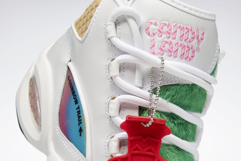 Zapatillas Kamikaze Question Mid: Una invitación a revivir la infancia. Este modelo de material mixto, hace homenaje a la primera zapatilla de baloncesto exclusiva de Allen Iverson y representa a los personajes clásicos de Candy Land en elementos clave como la icónica puntera y el talón, mientras que una ventana lateral vibrante inspirada en Rainbow Trail aparece desde la parte superior.