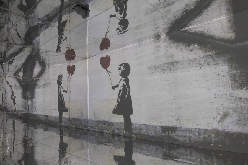 Además se podrán apreciar obras del artista reproducidas cuidadosamente con su técnica de “stencil”, incluida su creación «Escape», que apareció originalmente en la prisión cerrada de Reading en Inglaterra, y «Pulp Fiction» que retrata a las estrellas de la película Samuel L. Jackson y John Travolta apuntando plátanos en lugar de pistolas.