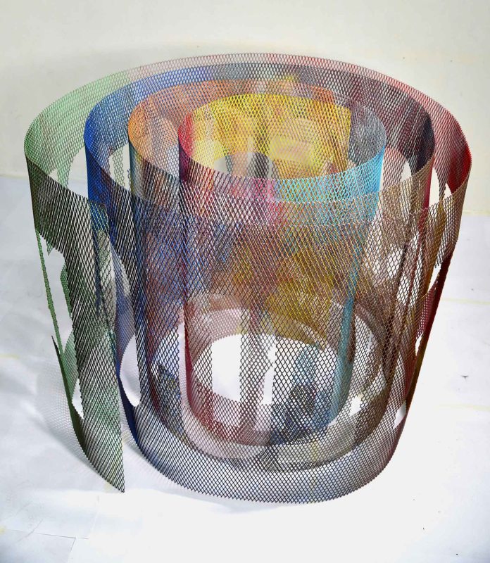 APUMANQUE está compuesta por tres obras: una pieza escultórica de 5 rollos de metal desplegado con un texto calado (con estrofas de la canción Eugenia), pintada con esmalte sintético; una estructura de metal enchapada en espejos (que cita al friso cinético de Matilde Pérez) y un objeto de cristal tallado en láser que alude al arte del disco Traga (1995) de Fiskales Ad-Hok.