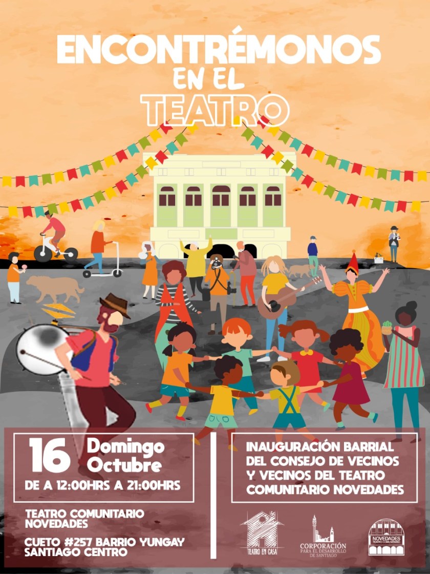 La actividad “Encontrémonos en el Teatro”, organizada por el Consejo Vecinal del Teatro Comunitario Novedades abre sus puertas con una programación de actividades abiertas al público. El evento de inauguración busca conmemorar el aniversario del trabajo comunitario que impulsó la reapertura del edificio patrimonial en el corazón del Barrio Yungay. La jornada se llevará a cabo el día domingo 16 de octubre a partir de las 12 horas hasta las 21:00hrs.