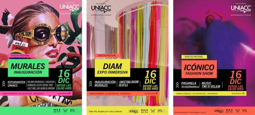 El viernes 16 de diciembre, las distintas carreras que conforman la Escuela de Diseño estarán realizando la primera edición de «Efecto Festival», evento que contará con un desfile de moda, la inauguración de murales y música y que estará llenando de colorido y creatividad el Campus Poniente de UNIACC, ubicado en Los Jesuitas 559.