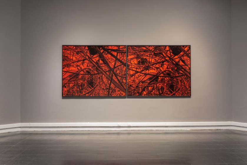 La exposición trasciende de lo puramente visual y envuelve al visitante con el ruido incesante de los aparatos y máquinas que aceleran el proceso destructivo al que los edificios fueron destinados. Lo escuchamos al entrar a la sala, lo identificamos y queremos taparnos los oídos casi de forma natural. Así, el martilleo que pulveriza el concreto se convierte en un ruido molesto que recuerda que no es posible un punto cero mientras la construcción no ha sido demolida por completo. No hay calma, no hay paz y no hay quietud bajo la acción de los latidos metálicos del martillo hidráulico.