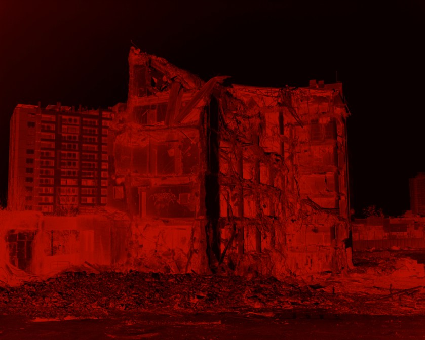 La contemplación de escombros conduce a una reflexión metafísica, un ejercicio meditativo y carente de verdades absolutas. En lo opuesto a un cuerpo uniforme, convertido en un todo que ya se diferencia de la materia prima, trozos de cemento se amontonan entre fierros torcidos y formas irregulares transformadas en lo que queda en pie. Qué hubo ahí; lo sabemos porque las imágenes nos sitúan en el después, y en cada encuadre, nos recuerda cuán atrasados llegamos a mirar.