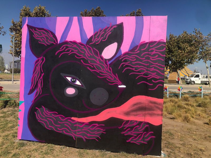 Esta idea se une perfecto a la temática que trabaja la artista: “Me dieron libertad creativa de hacer lo que yo quisiera, decidí hacer una reinterpretación de un mural que ya había realizado en la Alameda. Está el gato blanco por un lado del cubo y el gato negro por el otro. Esto representa el equilibro, es como el ying y el yang. Me gusta interpretar los híbridos, los espacios entremedios, no los extremos. Por ejemplo, el equilibrio entre lo fuerte y lo tierno”.