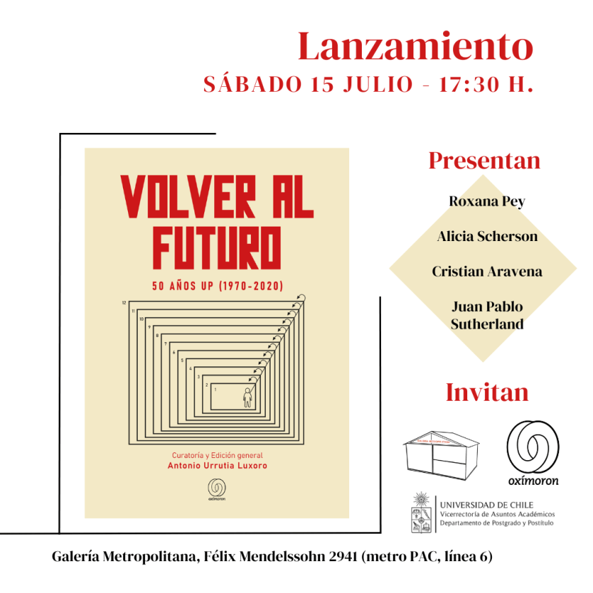 El lanzamiento de Volver al futuro: 50 años UP (editorial Oxímoron, 2023) será realizado el próximo sábado 15 de julio a las 17.30 hrs en Galería Metropolitana (Félix Mendelssohn 2941, Pedro Aguirre Cerda).