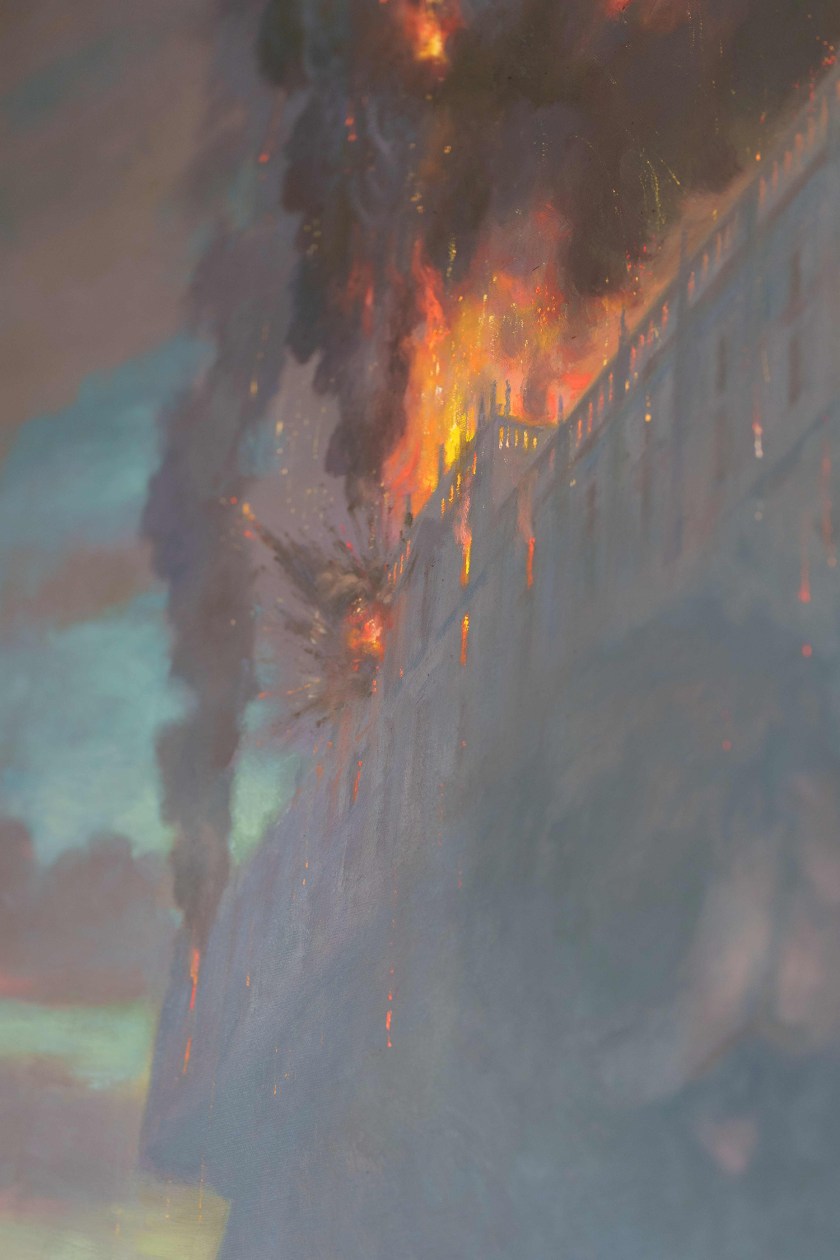 Por primera vez fuera de su taller, el registro de los procesos del artista en Sala Galia se torna relevante y permite conocer las estrategias de su cocina creativa. Abordando los 50 años pasados desde el golpe militar, JP Neira opta por el gran formato, a fin de configurar una imagen a la vez colosal y colisión representativa del infausto hecho. El registro sistemático en digital aporta el componente de renovación tecnológica, que rescata y permite difundir la performance del artista y su adaptación a esta nueva sala de experimentación.