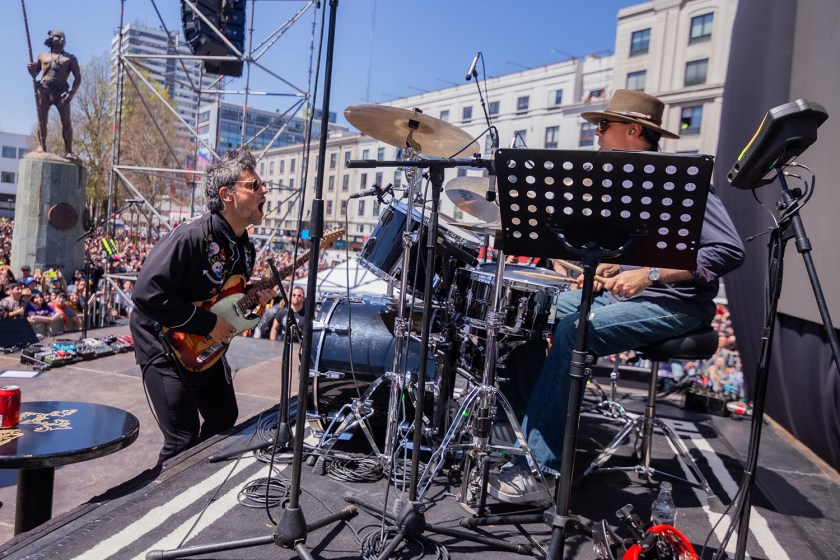 Los Tres, la banda más importante del rock chileno reunida con su formación original y más emblemática, brindó un emocionante concierto gratuito en la Plaza de la Independencia de Concepción, justo en medio de dos lugares significativos para la historia del grupo: el Aula Magna, donde hace décadas debutaron como grupo tocando junto a Los Prisioneros; y el Teatro de la Universidad de Concepción, donde tocaron por última vez en la ciudad antes de separarse la formación original en 2000, hace 23 años.