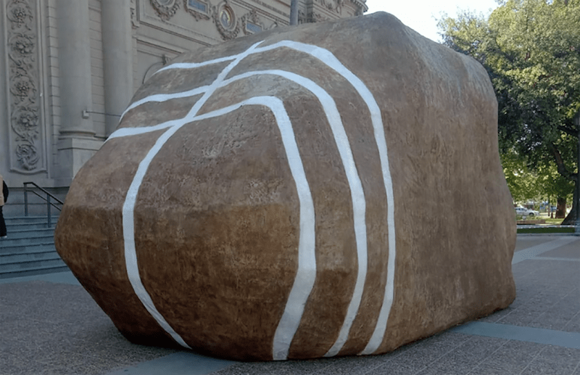 Hace unos días el frontis del Museo Nacional de Bellas Artes amaneció ocupado por una enorme piedra, sorprendiendo a transeúntes, conductores y visitantes del sector Parque Forestal. La piedra no solo ejerce una interrupción del paisaje cotidiano habitual en ese concurrido barrio santiaguino, sino que también altera la visibilidad de la escultura de Rebeca Matte, “Unidos en la gloria y en la muerte”, allí emplazada. La enorme estructura hace desaparecer esta clásica obra, que fuera donada al MNBA en 1930, un año después de la muerte de la escultora chilena.