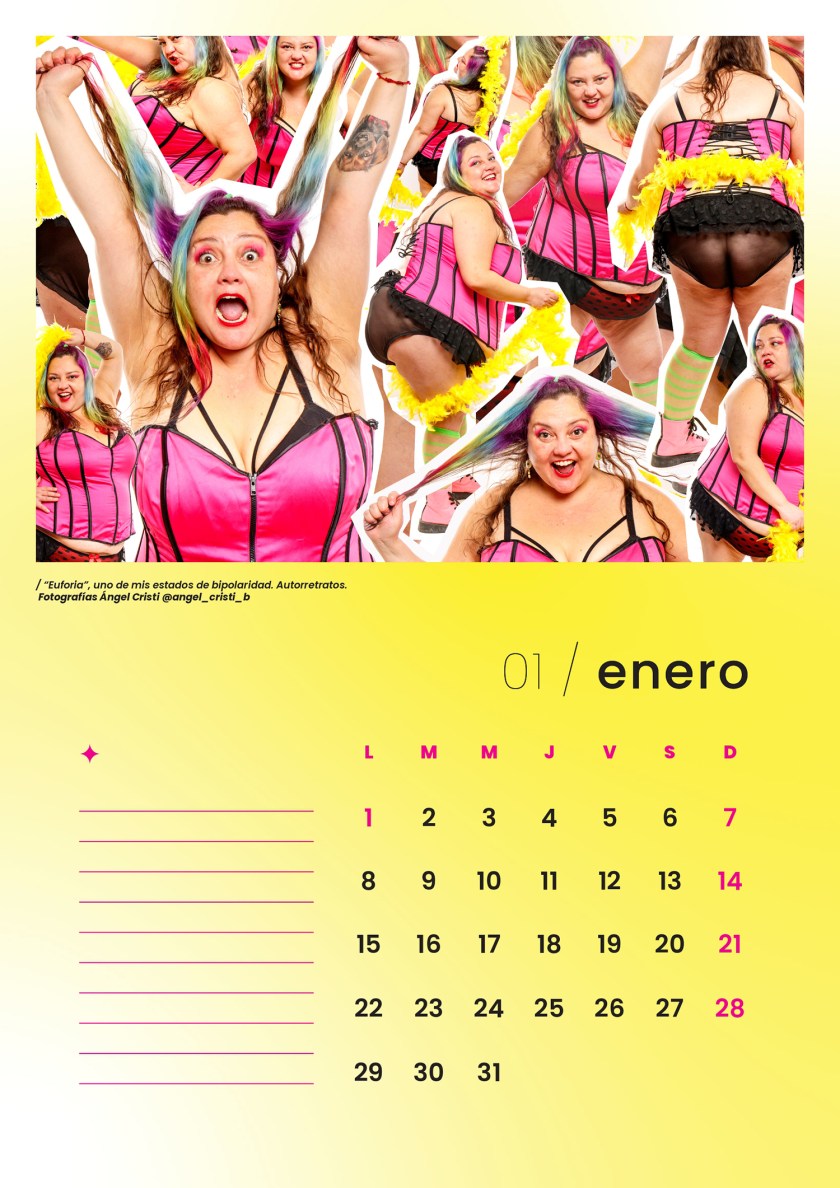A través del autorretrato, práctica que caracteriza la obra de la artista visual y fotógrafa Rocío Hormazábal, se da vida a la tercera versión de este calendario temático, con una crítica social basada principalmente en su biografía y su activismo por los cuerpos disidentes.