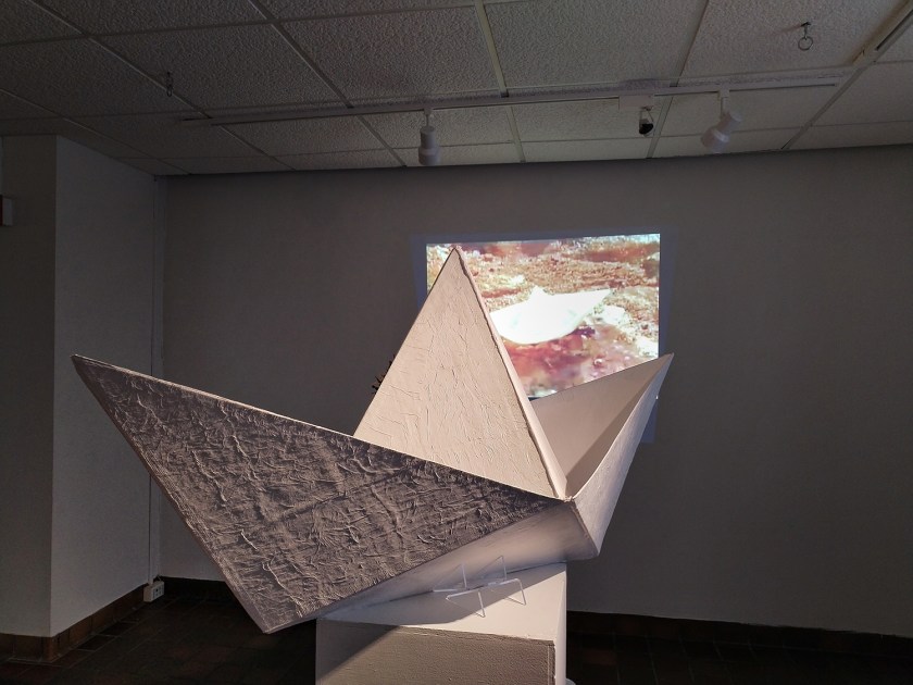 Desde ahí la artista declara “utilicé la metáfora del barco de papel, para hablar desde un lenguaje cercano sobre el impacto de la publicidad en la memoria colectiva, pero también profundizando en la ironía del desastre ambiental y el racismo reflejado en los dos comerciales analizados”. Desde ahí utilizando esculturas, música, performance y un vídeo performance que combina imágenes del monocultivo aún presente en sectores de la selva valdiviana y extractos de imágenes del documental en proceso “Bahía Coral” de la productora Audiovisual La Gaviota, se creó así una experiencia inmersiva y reflexiva en la cual la obra deja en evidencia las diversas estrategias del extractivismo presente desde la colonización, hasta la actualidad.