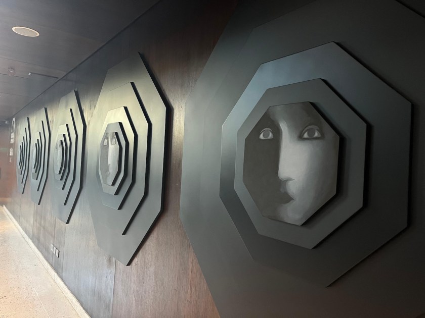 Se trata de una serie de rostros idénticos entre sí que parecen seguir al visitante con la mirada, los que ocupan cinco placas de madera de 1,50 m de diámetro pintadas con óleo opaco.