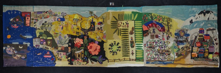 El mural de 7,74 m de ancho y 2,30 m de alto retrata las labores del valle central de Chile de mar a cordillera y llega a Venecia tras un viaje digno de contar. La confección de arte popular formó parte, junto a creaciones de artistas y artesanos renombrados, como Mario Toral, Roser Bru, Gracia Barrios y Alfredo Manzano, entre otros, de la colección de arte de la emblemática construcción del gobierno de Salvador Allende.