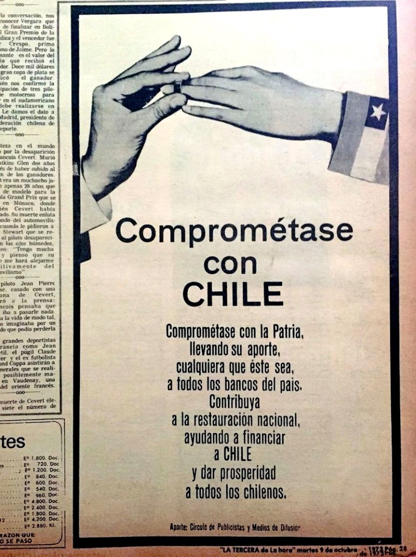 “Comprométase con CHILE” es el título de la nueva exposición que se tomó la vitrina de Galería Hifas en Barrio Yungay. Se trata de un montaje realizado por la artista visual y orfebre Milena Moena el cual corresponde a una primera vista de la investigación que lleva realizando desde hace un año y medio, la cual trata sobre una campaña que se hizo en Dictadura donde se invitaba a las personas a donar sus argollas de compromiso y matrimonio, con ese gesto salvarían la economía del país; a cambio le daban un anillo de cobre con la inscripción de la palabra “Chile” dentro.