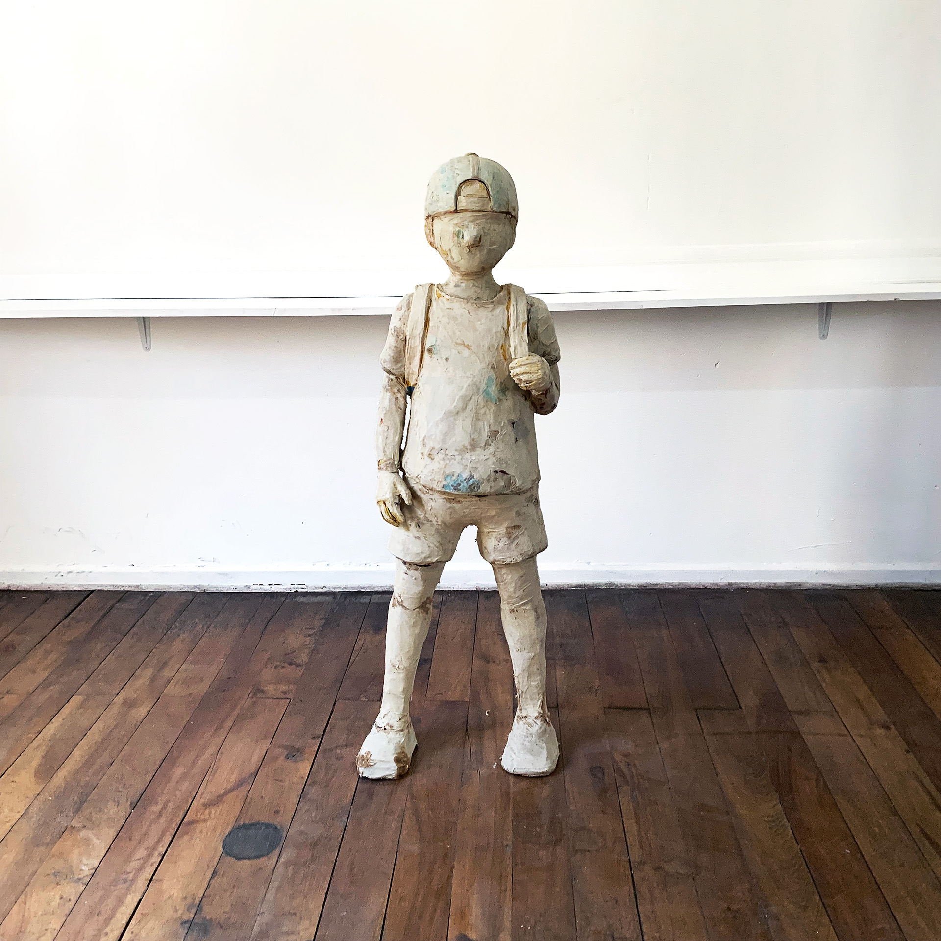 La Espera Cero de Endi Paredes resulta inquietante como toda buena obra de arte debe inquietar a quien la aprecia, es que la espera, el acto y acción de esperar es en esencia de una quietud que calza muy bien con el soporte físico que dan las esculturas a la expresión artística de Paredes, donde la acción congelada toma cuerpo y eternidad, pero es la misma materialidad dela obra la que le imprime dinamismo a las figuras de los niños que nos muestra el artista de origen venezolano. Las capas de ropa, unidas y esculpidas para tomar forma de infancia, dan cuenta de la profundidad de los relatos que callan las niñeces sin rostro que miran a la audiencia y al vacío, narran los desplazamientos, las donaciones, los vestigios que la violencia deja en la piel y la expectación de un futuro diferente.