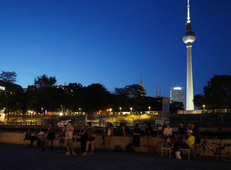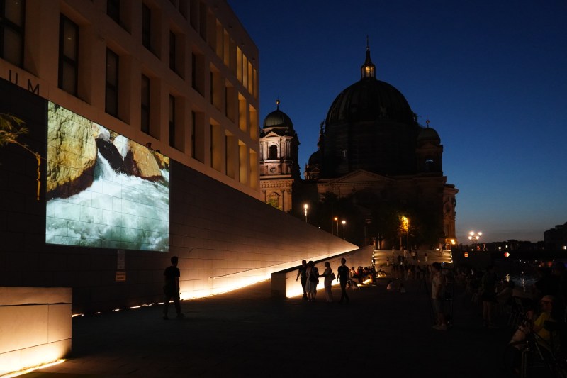 La acción reunió a más de 500 personas en las orillas del río de la capital alemana. Las y los participantes pudieron presenciar el diálogo entre ambos cursos de agua, acompañados del mapping del videoarte “Origen: 33o22’25’’S 70o23’50’’W 17.67km 65.3oNE», con una obra sonora compuesta por la artista española Claudia Casasola.